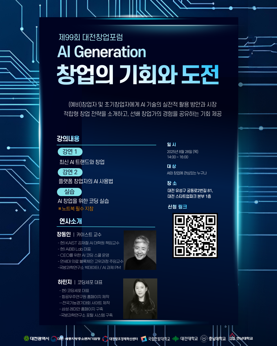 fnctId=bbs,fnctNo=149 URL복사 글번호 102090 [외부] 제99회 대전창업포럼 [인공지능(AI) 시대, 창업의 기회와 도전] 개최 안내 작성자 황성민 작성일 2025.08.21. 수정일 2025.08.23. 조회수 123 첨부파일 붙임. 제99회 대전창업포럼 포스터.png